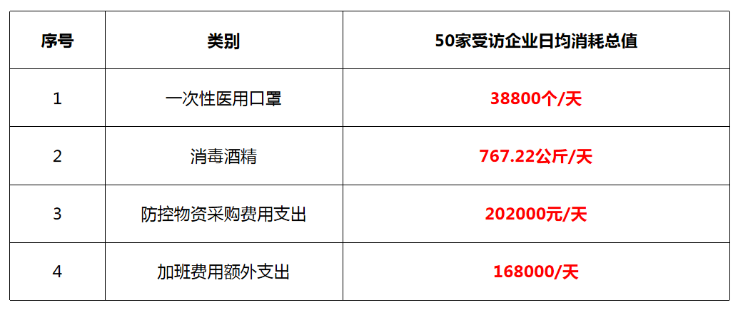 受访50家企业每日投入防疫物资采购费用总额约为20.2万元。