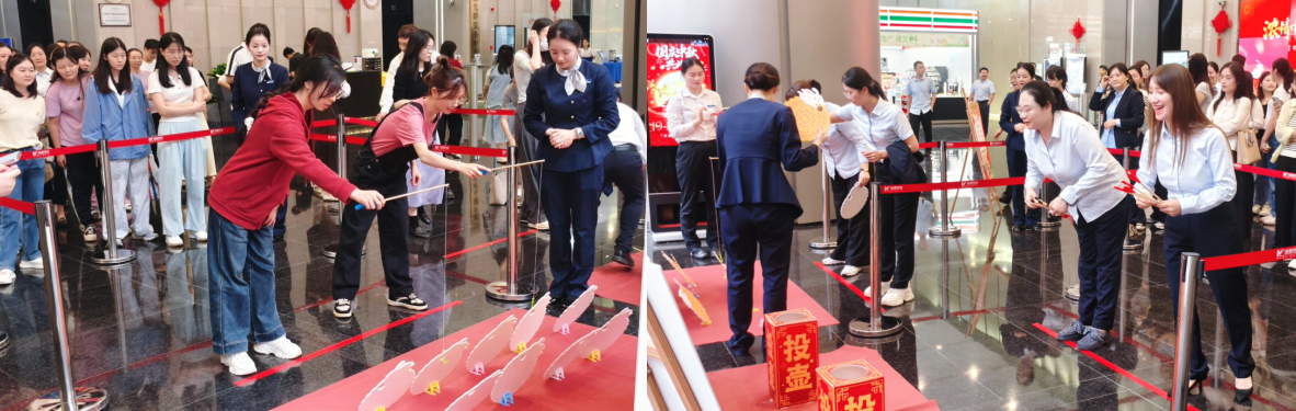 与此同时,写字楼里的节日活动同样精彩纷呈,传统游戏与现代互动交织,洋溢着欢声笑语。投壶区成为人气焦点,白领们凝神静气,力求“箭”指壶心,在挑战中感受古风雅趣;创意十足的钓月饼环节妙趣横生,各路“钓手”各显神通。这些丰富多彩的活动不仅让楼宇职工在忙碌工作之余放松身心,更让他们近距离感受到中华优秀传统文化的魅力。
