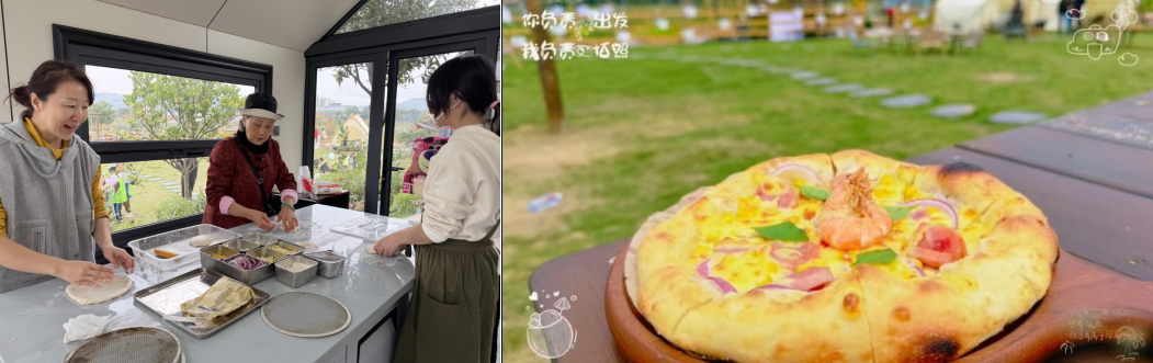 田园探秘过后,最受期待的DIY荔枝木炉披萨环节正式开启。长者们围在操作台前,跟着老师一步步揉面、擀皮、铺芝士与馅料,动作虽不熟练却格外认真。当亲手制作的披萨送入荔枝木炉烘烤时,大家便围在炉边静静等候,空气中渐渐弥漫开芝士的浓香与木材的烟火气。出炉的披萨热气腾腾,咬下一口外焦里嫩,长者们互相分享着自己的“作品”,夸赞声与笑声交织在一起,格外暖心。