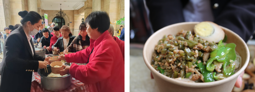 长寿面品鉴区内,工作人员提前熬煮好高汤,清早现炒的码子,香浓的卤蛋,将筋道的面条搭配爽口小菜,一碗碗递到长者手中。“吃了这碗面,愿您身体硬朗,福寿绵长!”一句句祝福让长者们端着热面笑开颜,不少人与老邻居并肩而坐,边吃边唠起家常,热气氤氲中满是烟火温情。