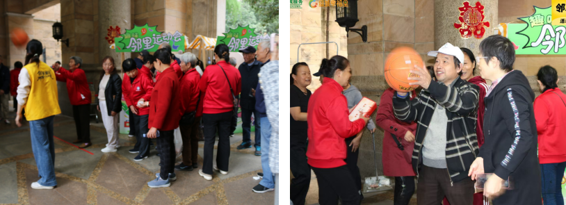 热闹不止于餐桌,过道旁的邻里趣味赛区域,更是成了长者们的“欢乐小天地”。