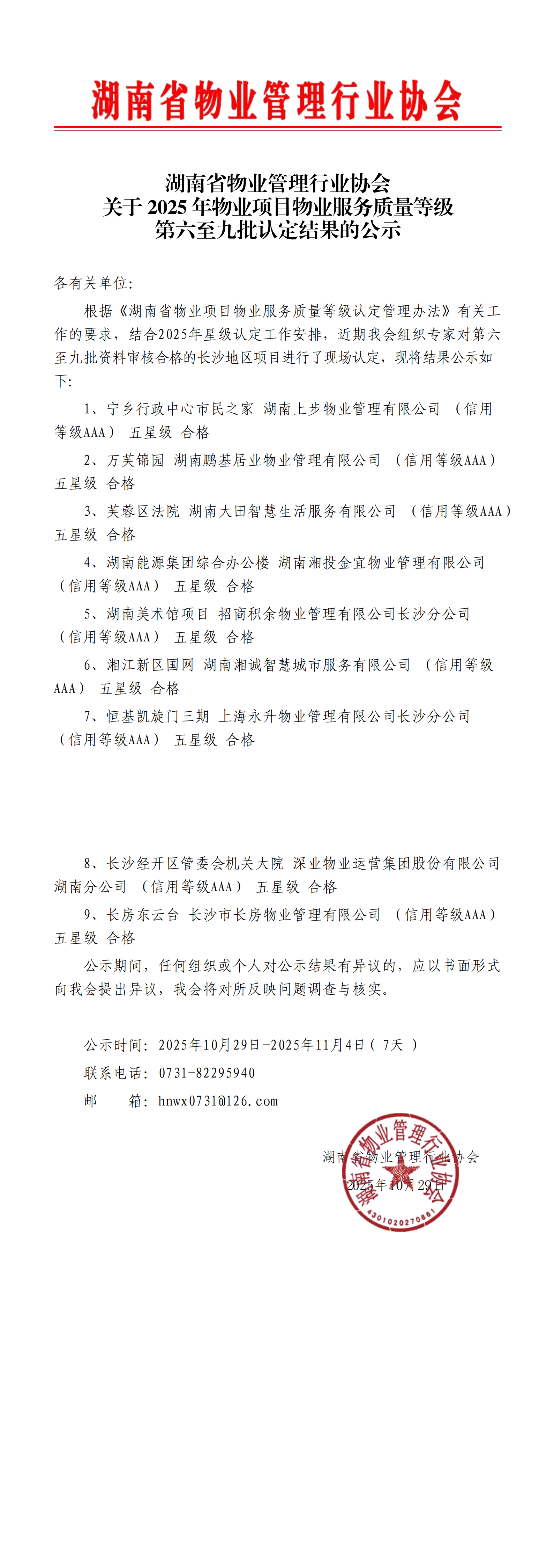 湖南省物业管理行业协会关于2025年物业项目物业服务质量等级第六至九批认定结果的公示