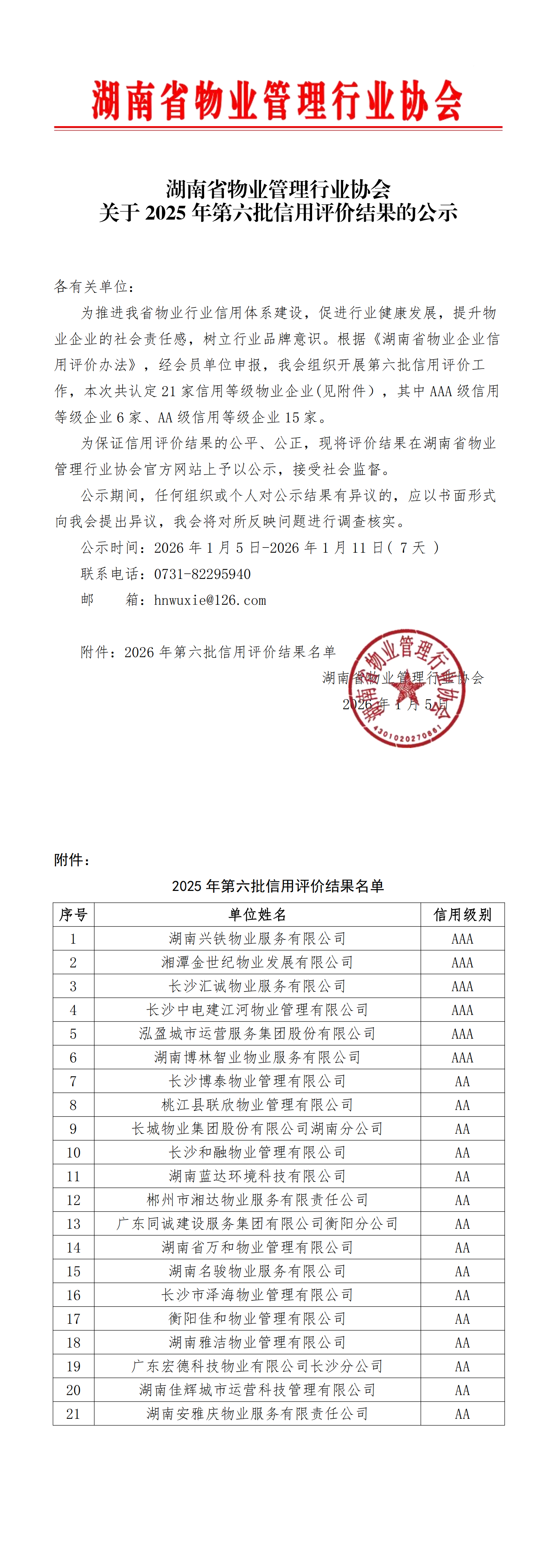 湖南省物业管理行业协会关于2025 年第六批信用评价结果的公示