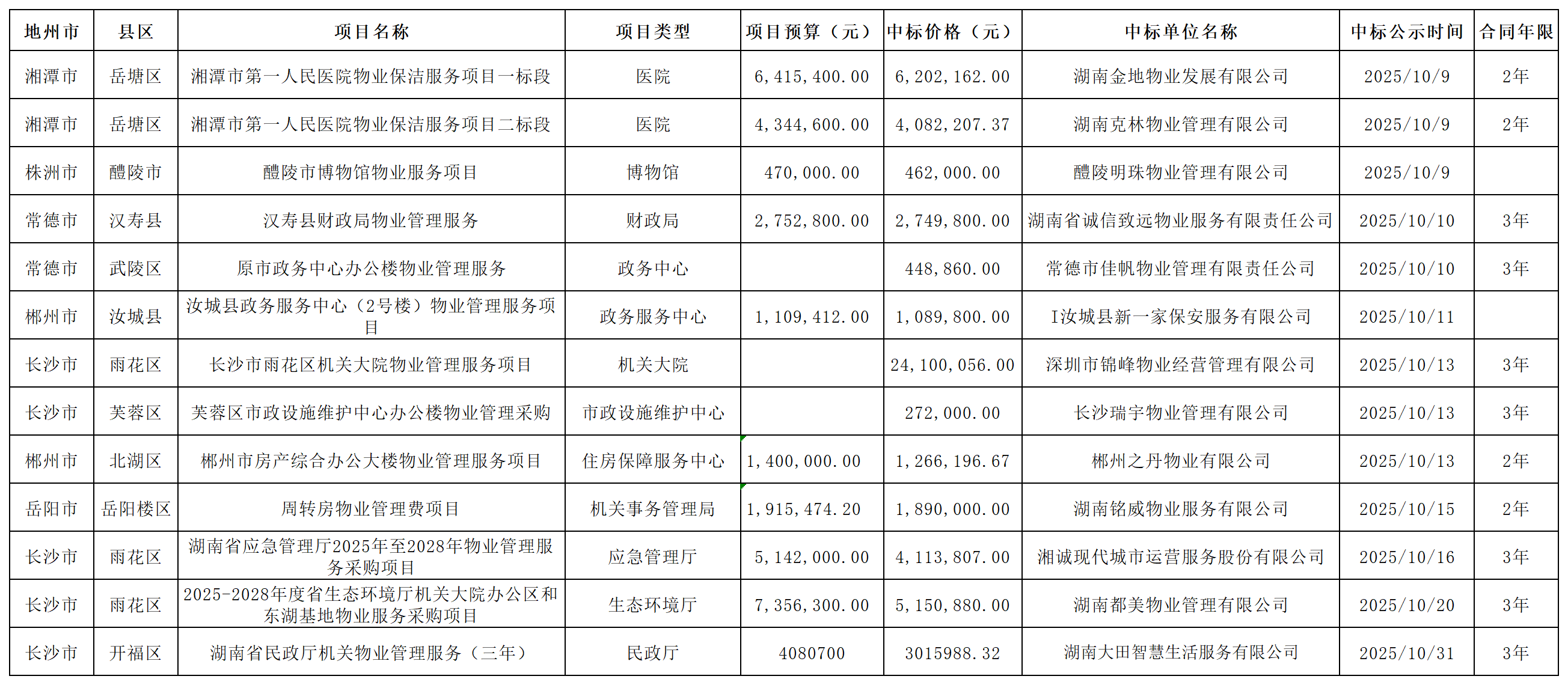 2025年10月湖南省物业行业政府采购中标项目